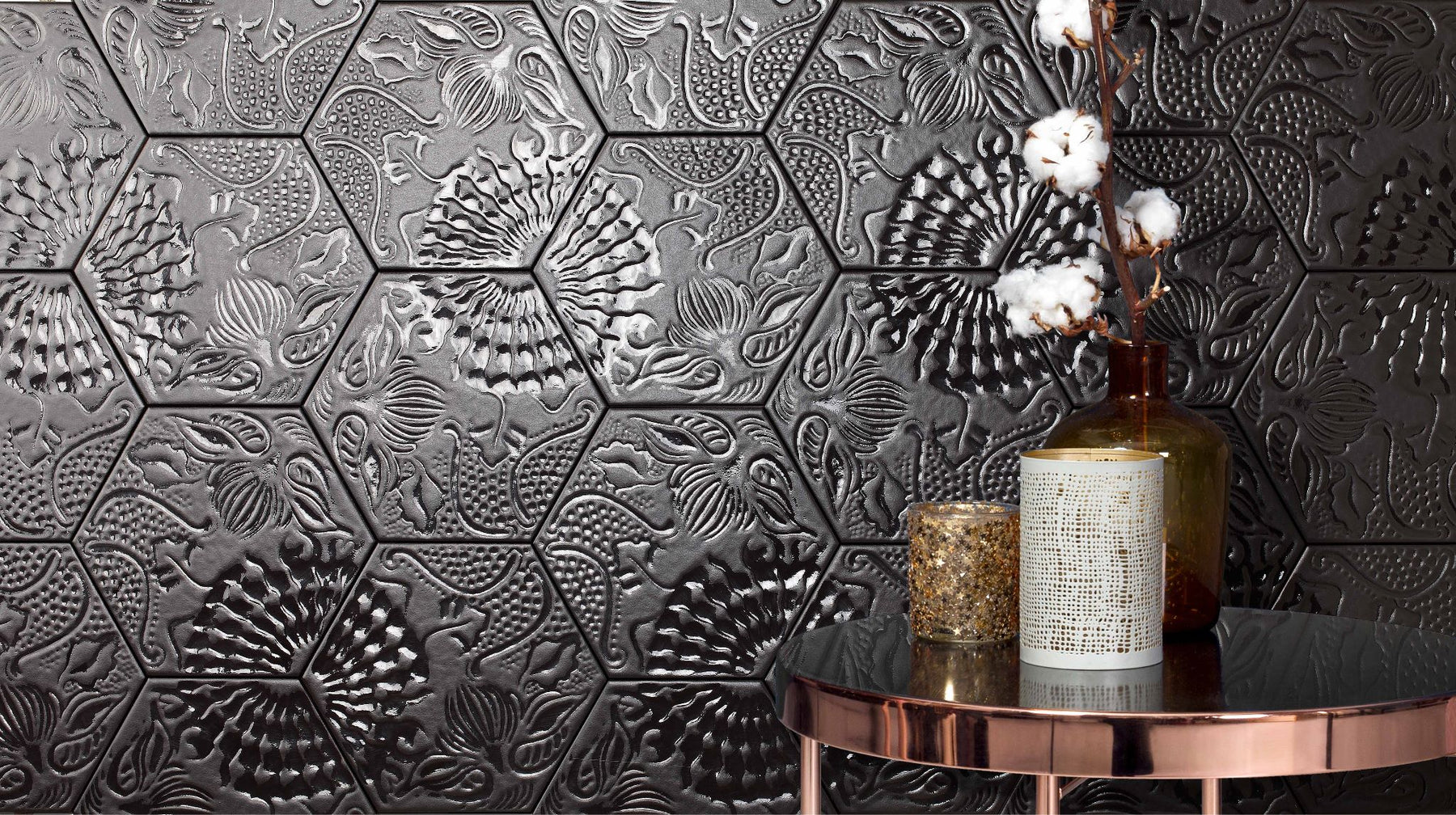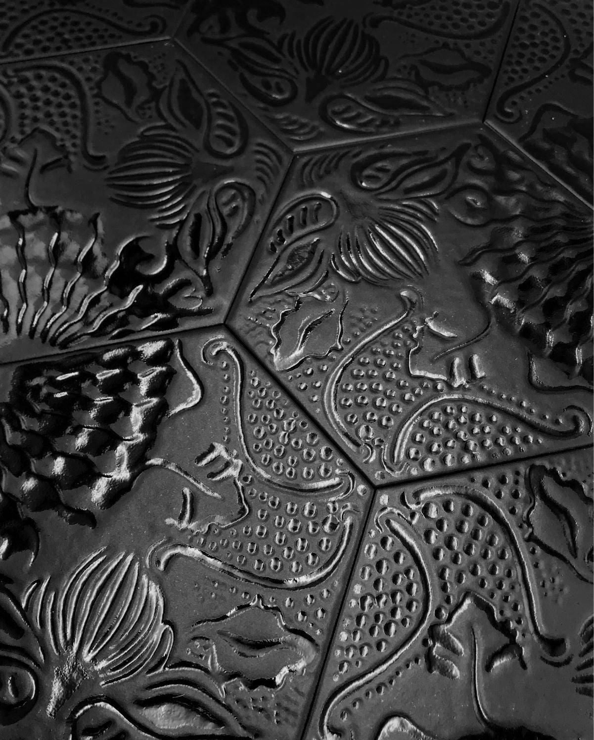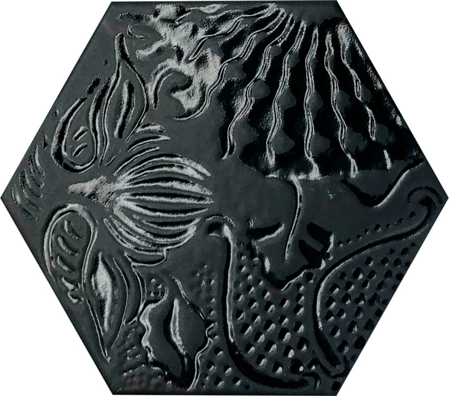 This luxurious black hexagon tile features intricate tropical relief designs, adding texture and sophistication to any space. Measuring 20x25 cm, it offers a subtle matte and glazed porcelain finish, ensuring durability and easy maintenance. Crafted in Spain, this tile combines elegant aesthetics with high-quality craftsmanship, ideal for creating refined, nature-inspired interiors. Each box covers 1.04 m² (11.19 sq ft), perfect for professional projects requiring both style and performance.