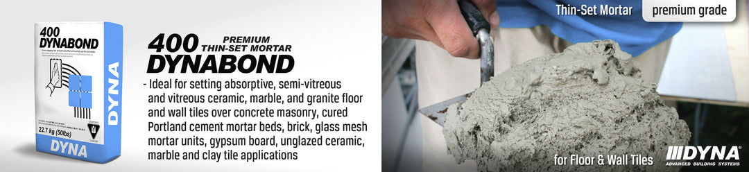 DYNA® DYNABOND 400 | Thin-Set Mortar (for Floor & Wall Tiles) (Premium Grade) is a Portland cement powder, graded silica aggregates and chemicals carefully selected and controlled by DYNA Corporation. It is a resin reinforced high shear bond strength dry-set thin-set mortar. It provides a permanent installation with high bond strength and requires no soaking of tiles. DYNABOND 400 is resistant to water after being cured but does not provide a waterproof barrier. Areas with prolonged contact with water, DYNALASTIC 5000 should be used in place of water when mixing. When mixed with DYNALASTIC 5000 it may be installed for indoor residential and light to moderate commercial floors and countertops in dry areas only over CSA-0211 EXTERIOR SELECT or (SEL TF) Douglas Fir plywood according to COFI classification, vinyl asbestos tile and dry cut-back adhesive. For increased freeze/thaw resistance mix with DYNALASTIC 5000 in place of water. For the installation of porcelain stoneware tile DYNALASTIC 5000 should be used in place of water.