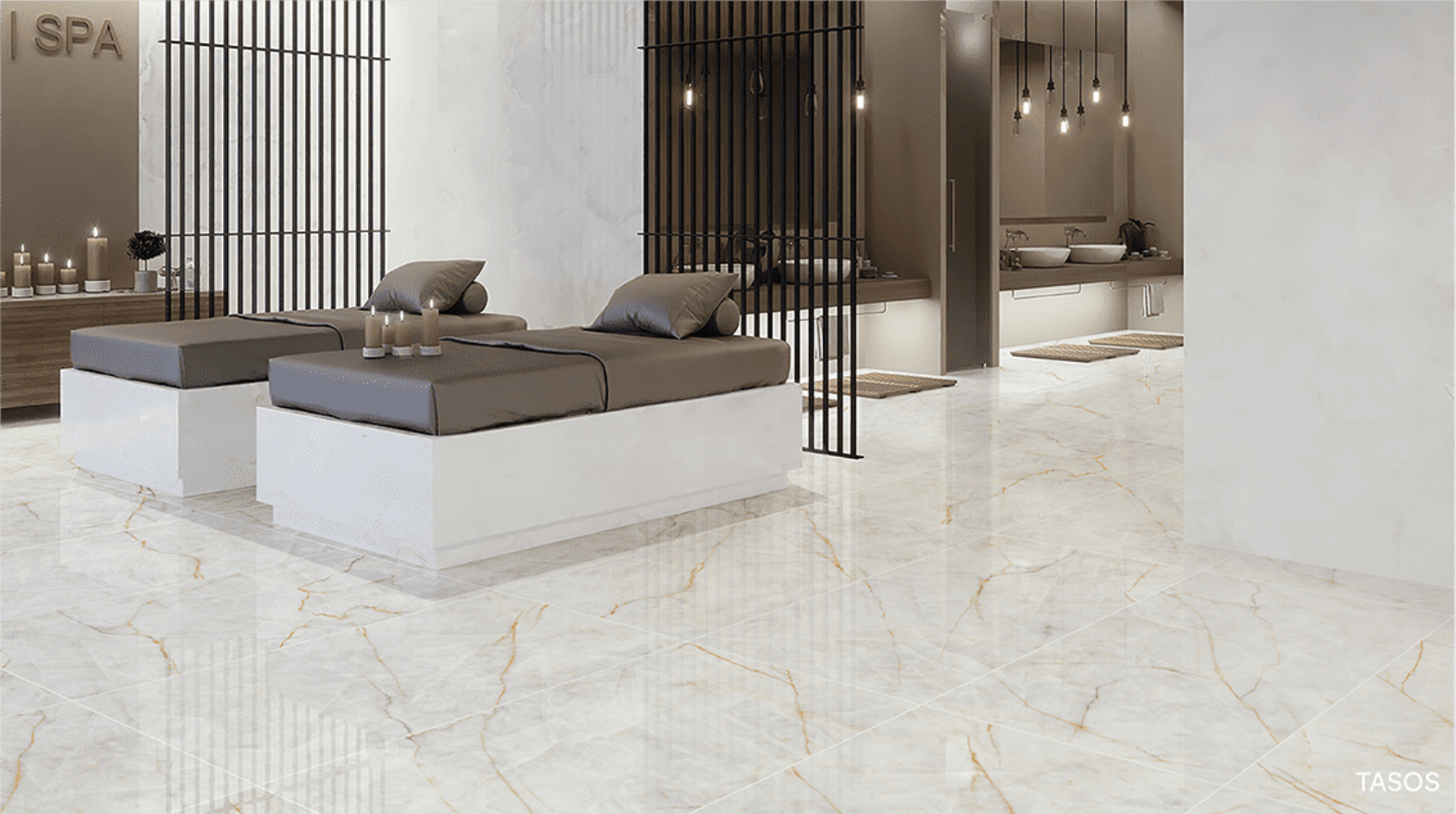 TASOS porcelain marble tiles bring sophisticated elegance to any space with their authentic gold marbling patterns. These 60x120cm floor tiles feature a matte glazed finish that combines visual warmth with practical durability. The refined veining mimics natural marble while offering superior resistance to wear, moisture, and staining—ideal for high-traffic areas.  Perfect for creating statement floors that balance luxury aesthetics with long-lasting performance.